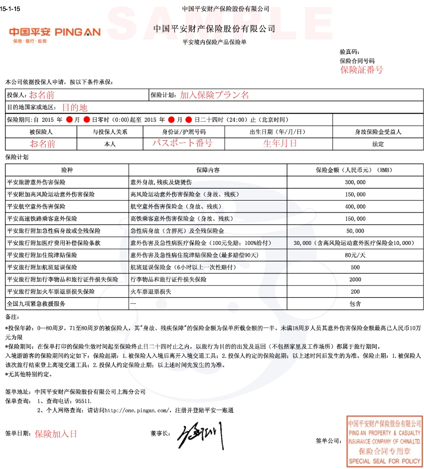 ※上記保険は、1名様 1枚のみ購入可能となります。 ※保険証サンプルは こちら をご覧下さい。