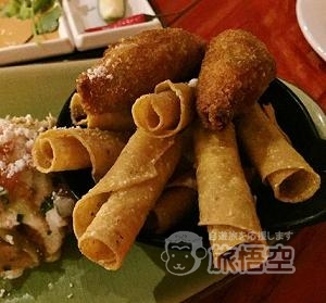 カリカリッに揚げられたタキートスは2種類。チキン&チョリソ。お酒にピッタリ!